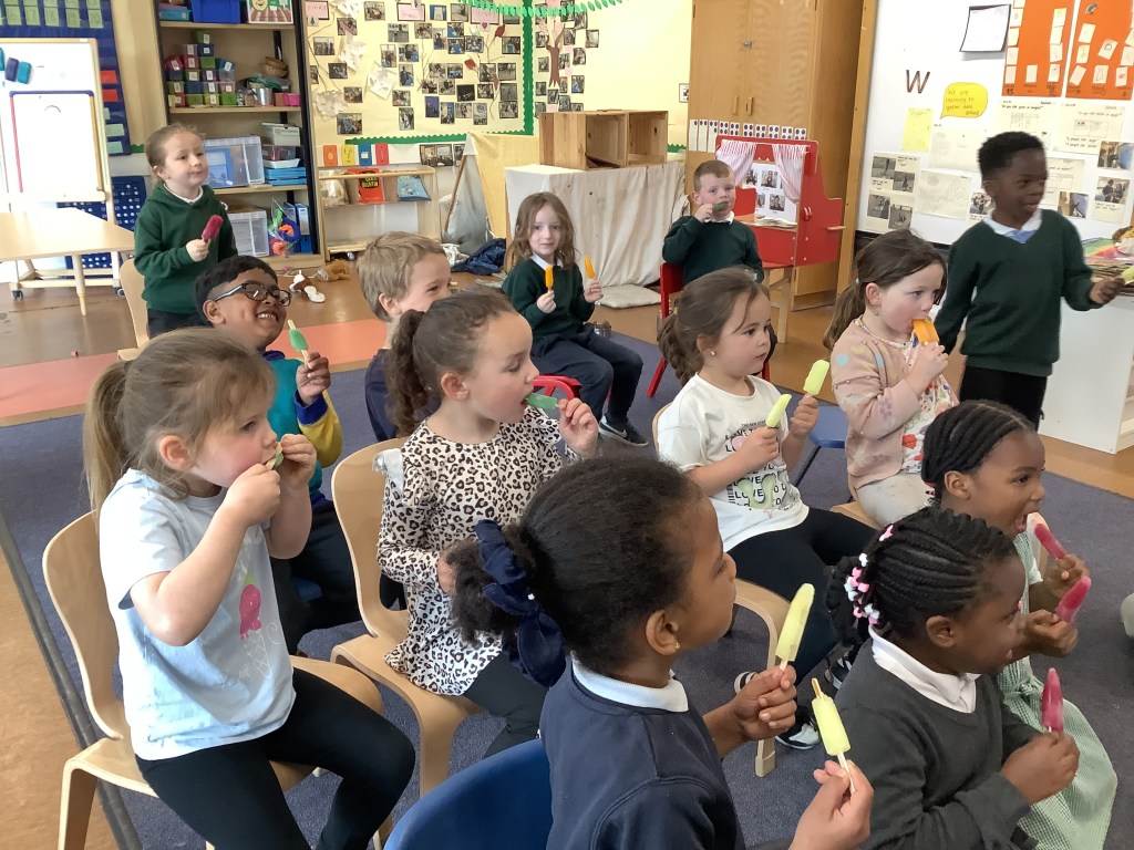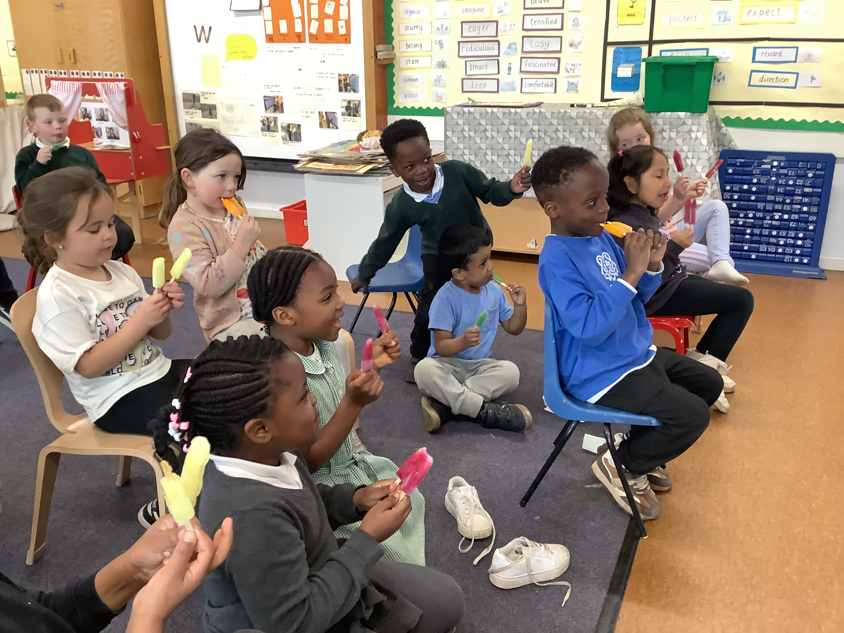Primary 1 enjoyed taking part in lots of different activities in Wellbeing Week. They enjoyed playing football, meeting Archie the dog and doing an obstacle course. We also enjoyed doing lots of events at Sports Day with the nursery children. At the end of the week everyone enjoyed a delicious ice lolly while looking at photos of Sports Day.
