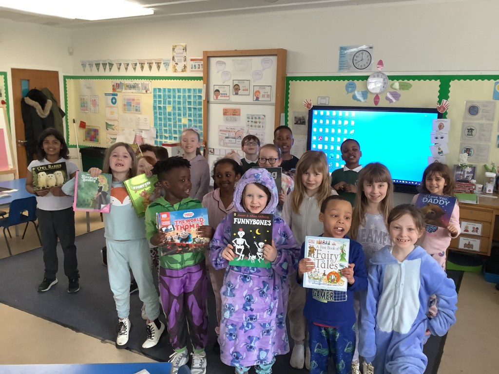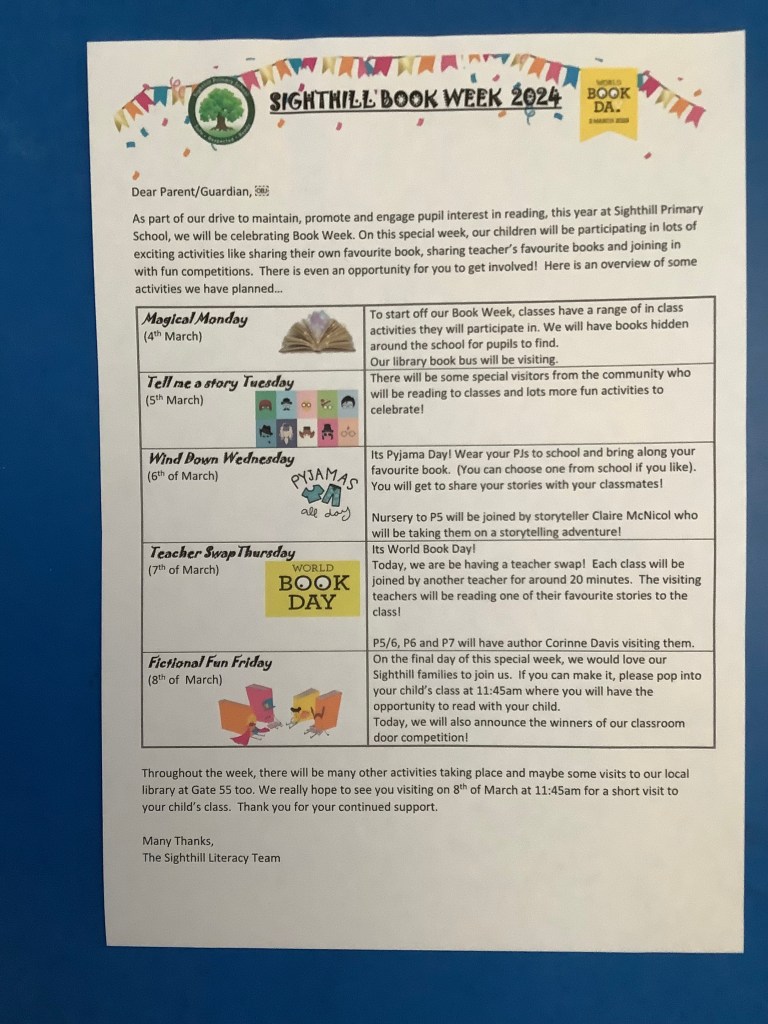 We began the week with a visit to the Book Bus and have continued to read our class novel, “The Day I Fell into a Fairytale”. On Tuesday we enjoyed a story and songs from Claire McNicol and on Wednesday we got to wear our PJs and bring our favourite stories into school. On Thursday we buddied up with the P7s for reading and by Friday we had completed our door display ready for the classroom door competition!
