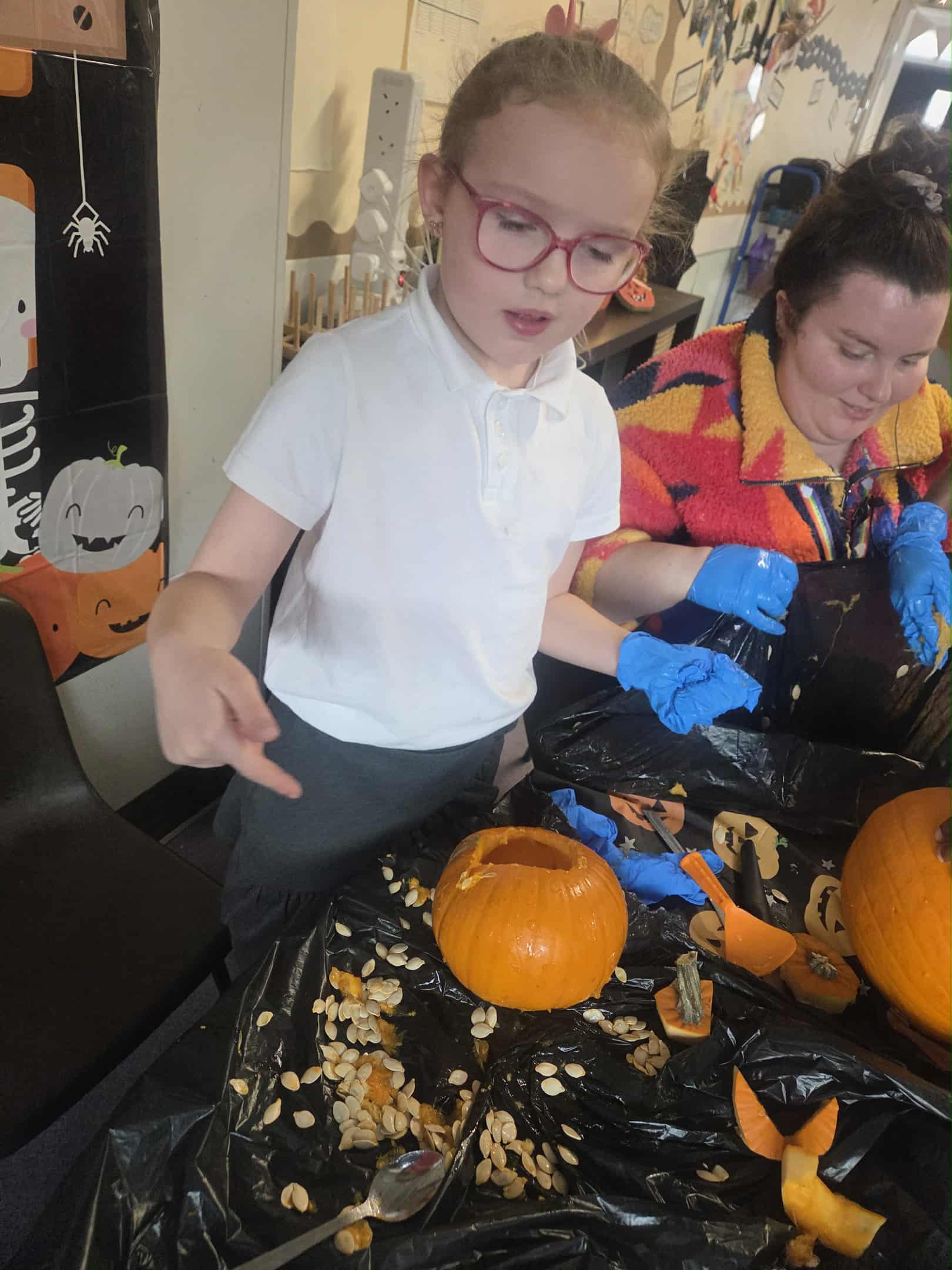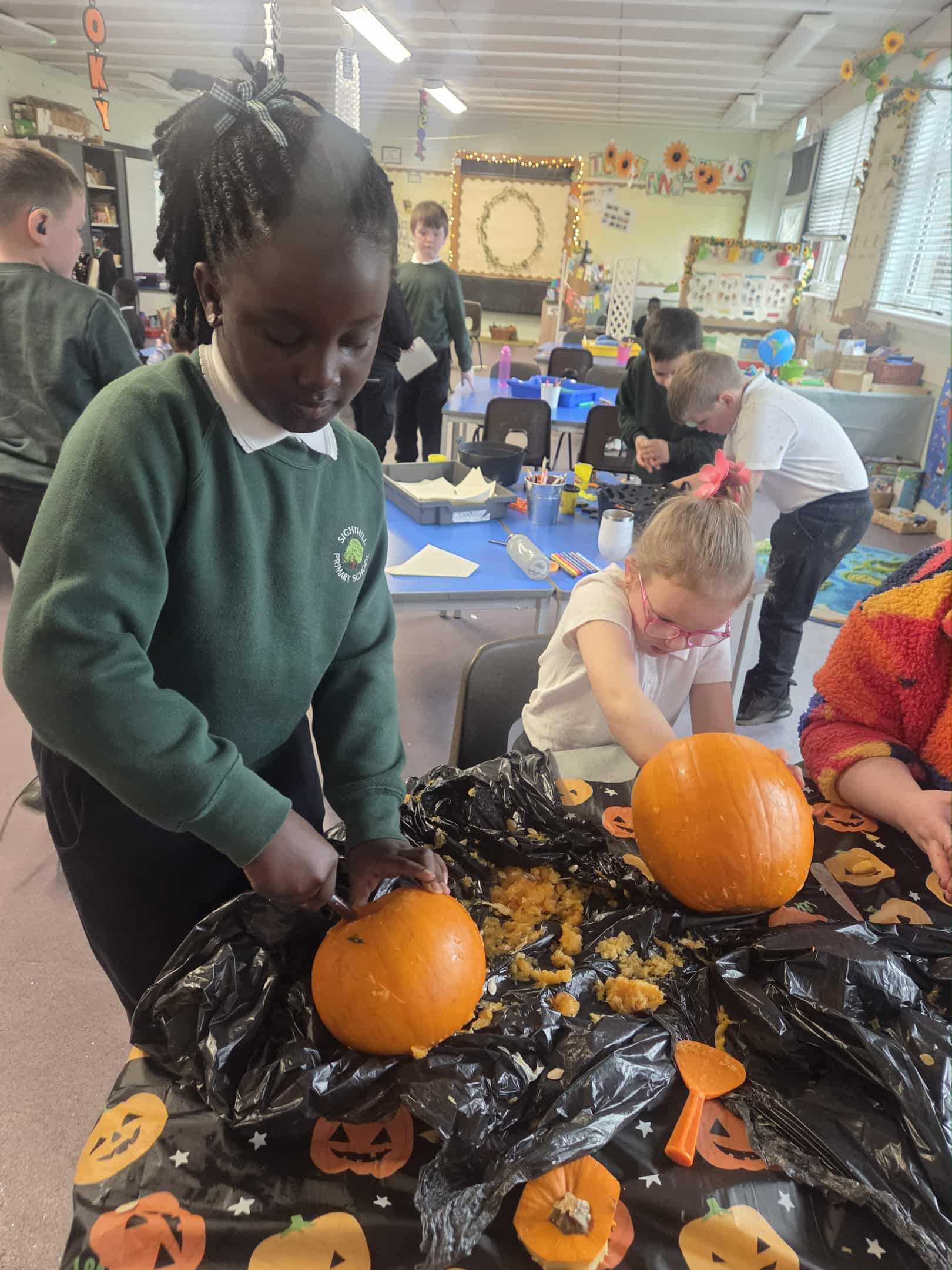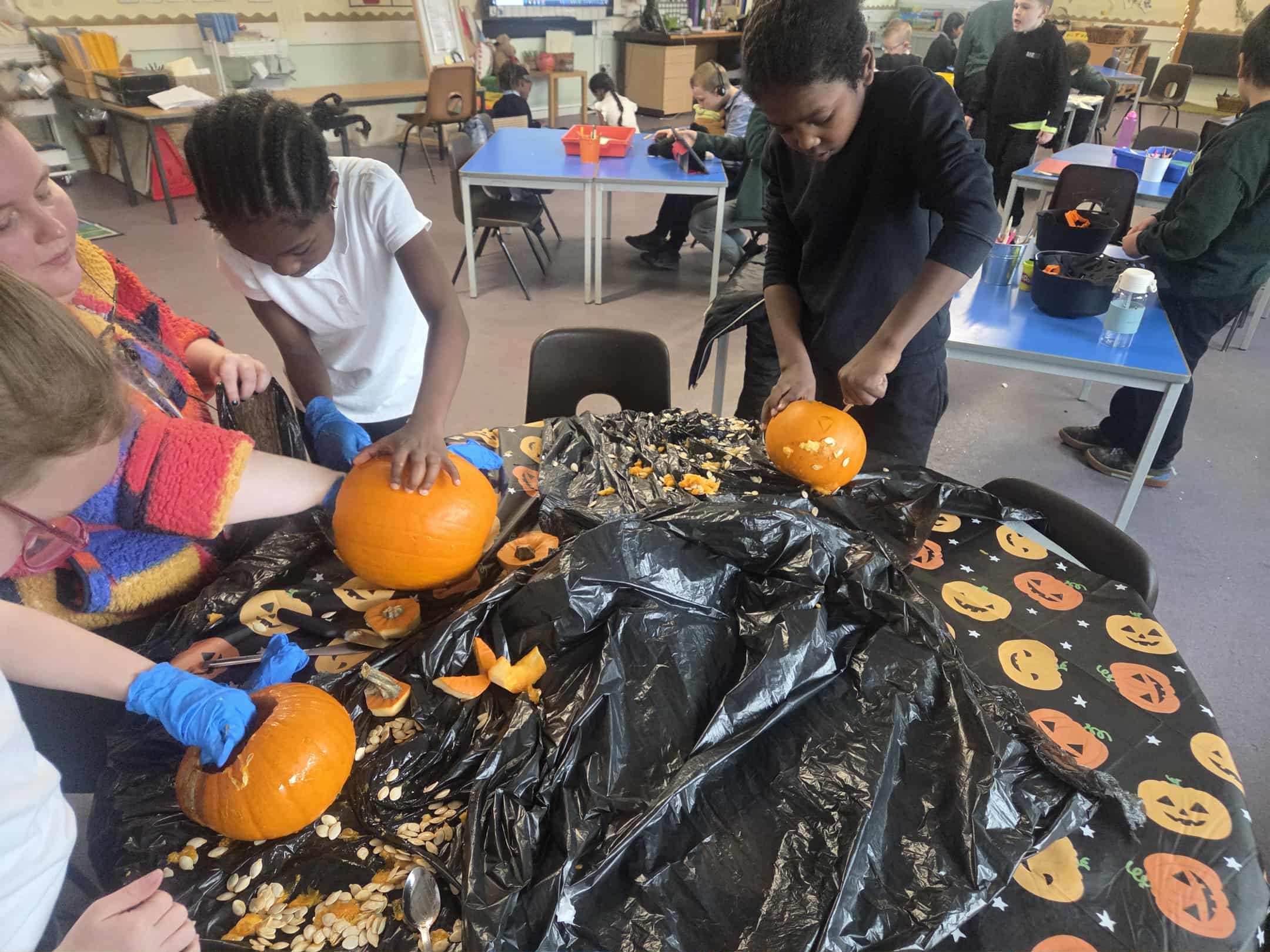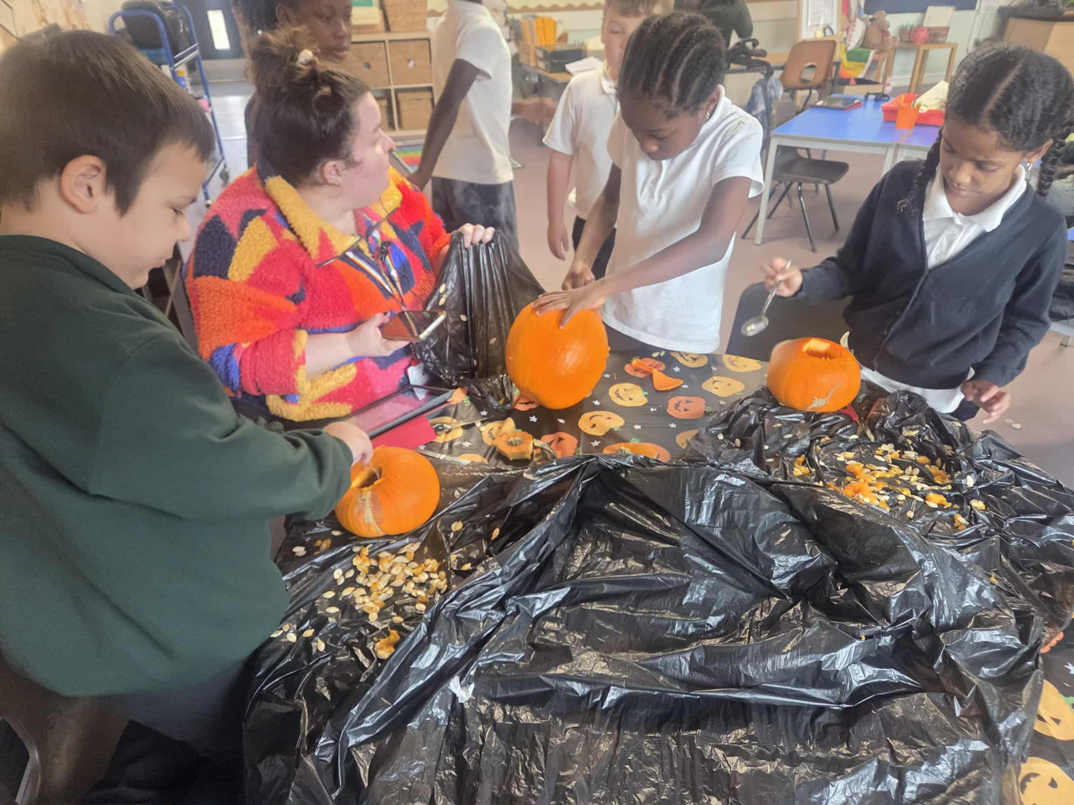 We had a great morning today celebrating all things spooky and autumnal. We carved pumpkins, iced biscuits, ate cake, watched a Halloween cartoon and did some Trick or Treating for our classmates. Lots of funny jokes were told.