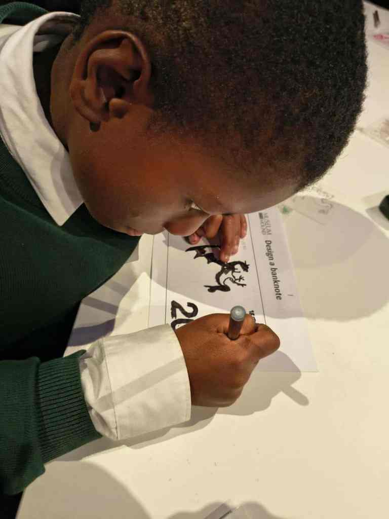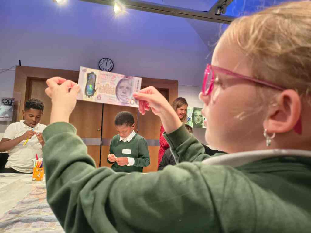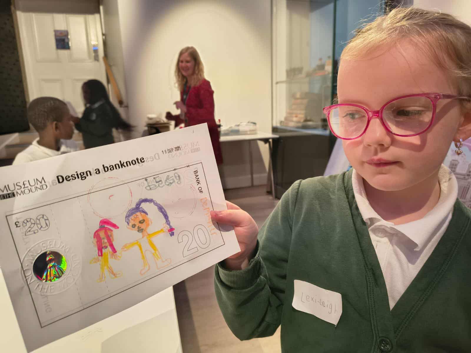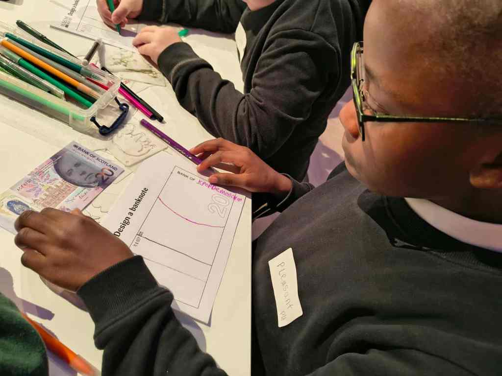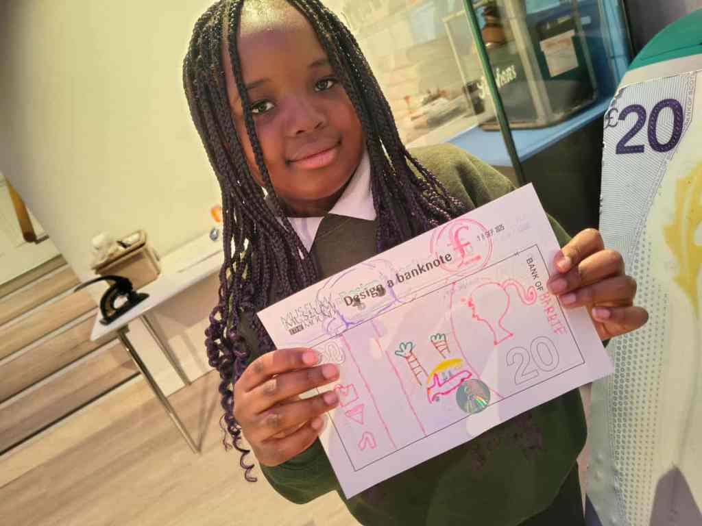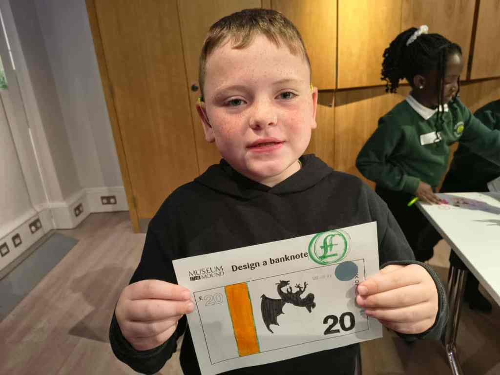 We have enjoyed learning about money in the classroom and we were lucky enough to get to visit the Museum on the Mound. We had 3 fantastic workshops – 1. Design a banknote, 2. How money was stored in the olden days and 3. What was used as money in the olden days.
