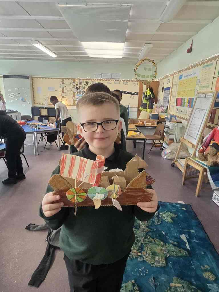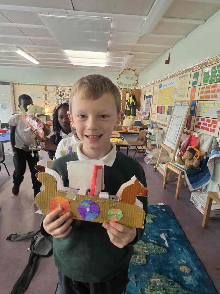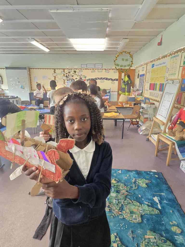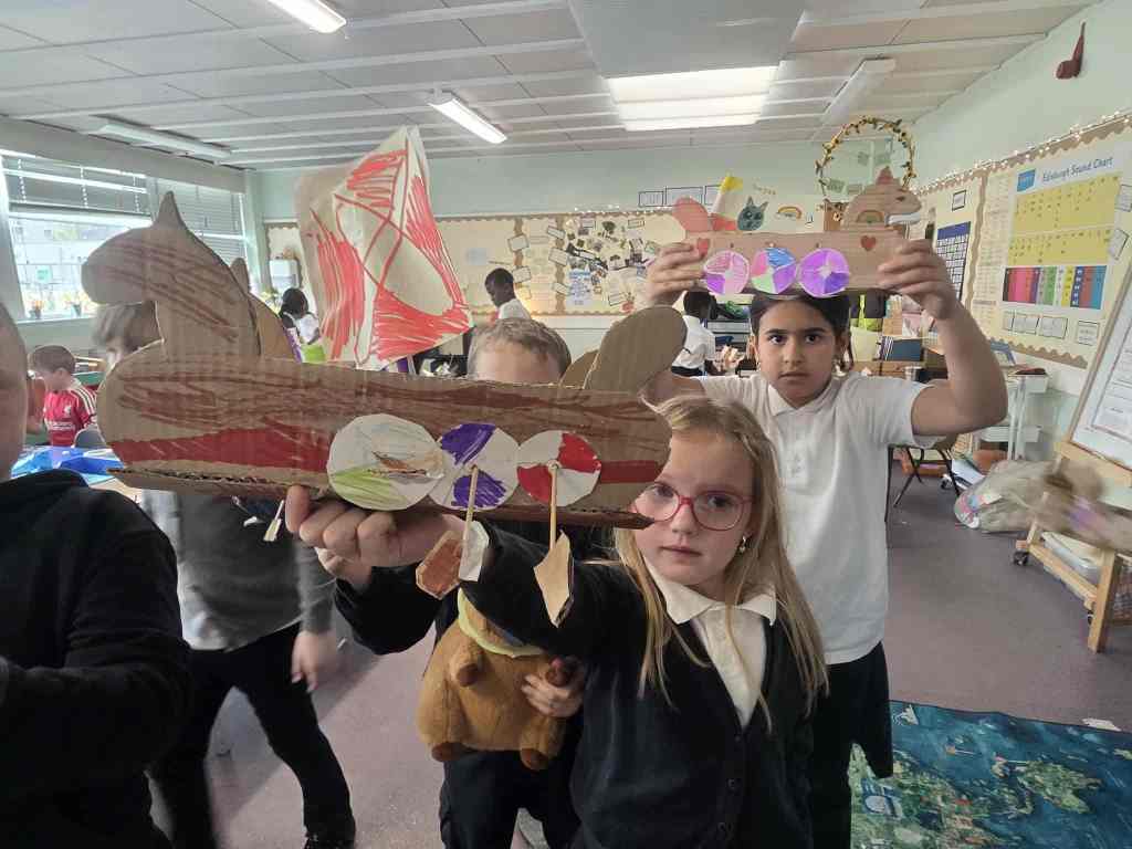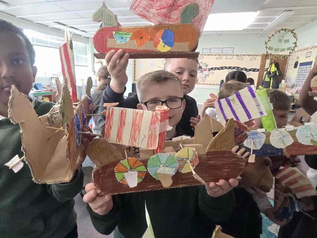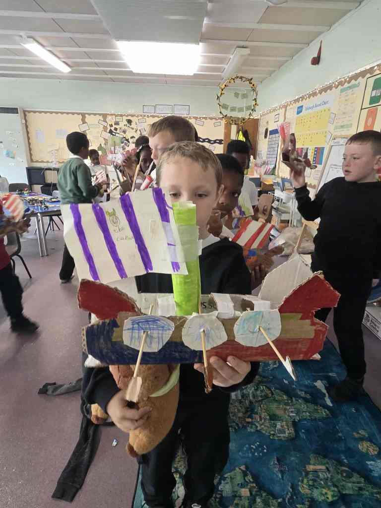 Wow we worked hard creating and building our Long ships. It took 5 different lessons to complete all the different elements of the ship – the mast, sail, oar holes, oars, rudders and the ship itself. We are very proud of the final result.