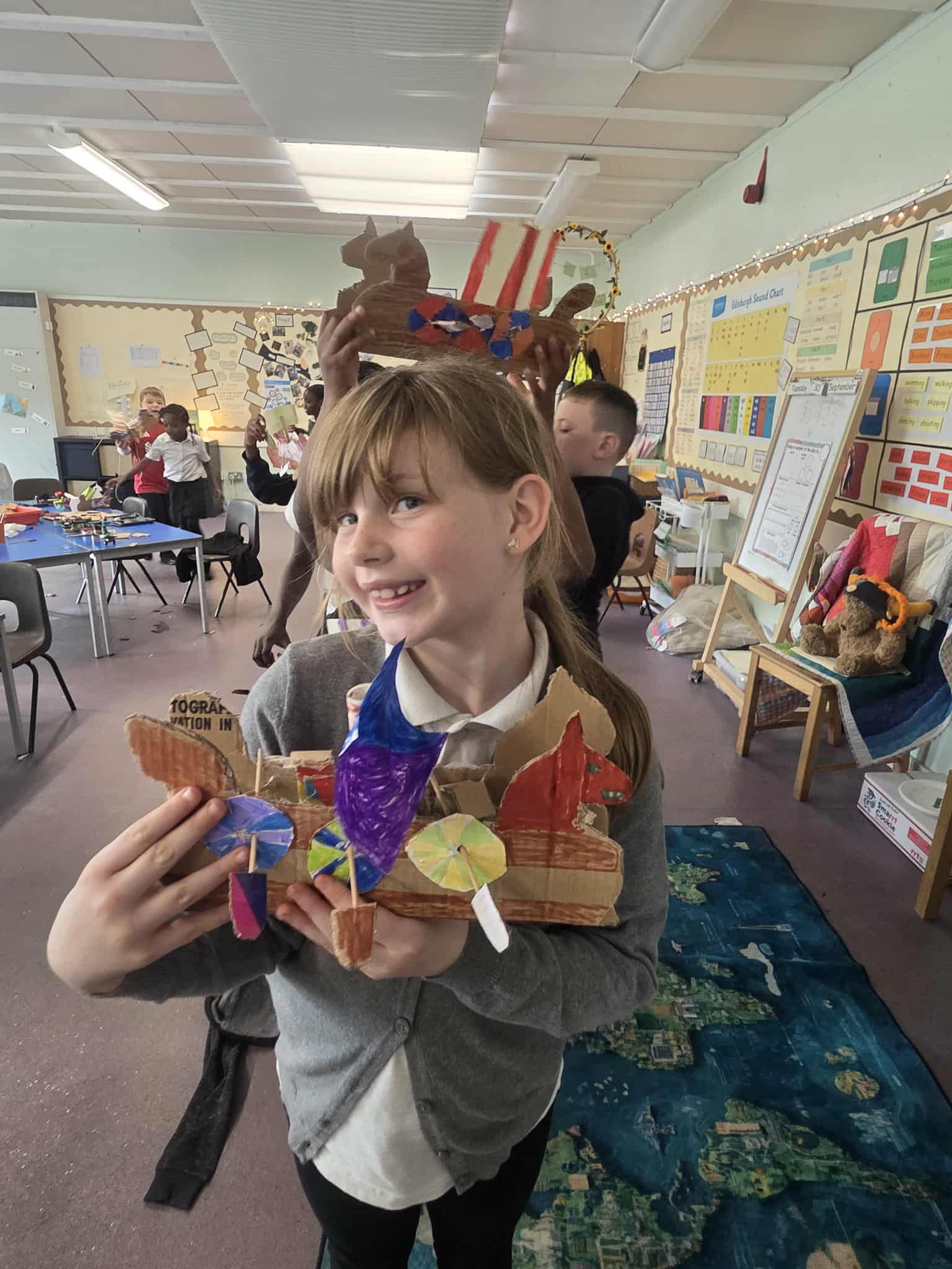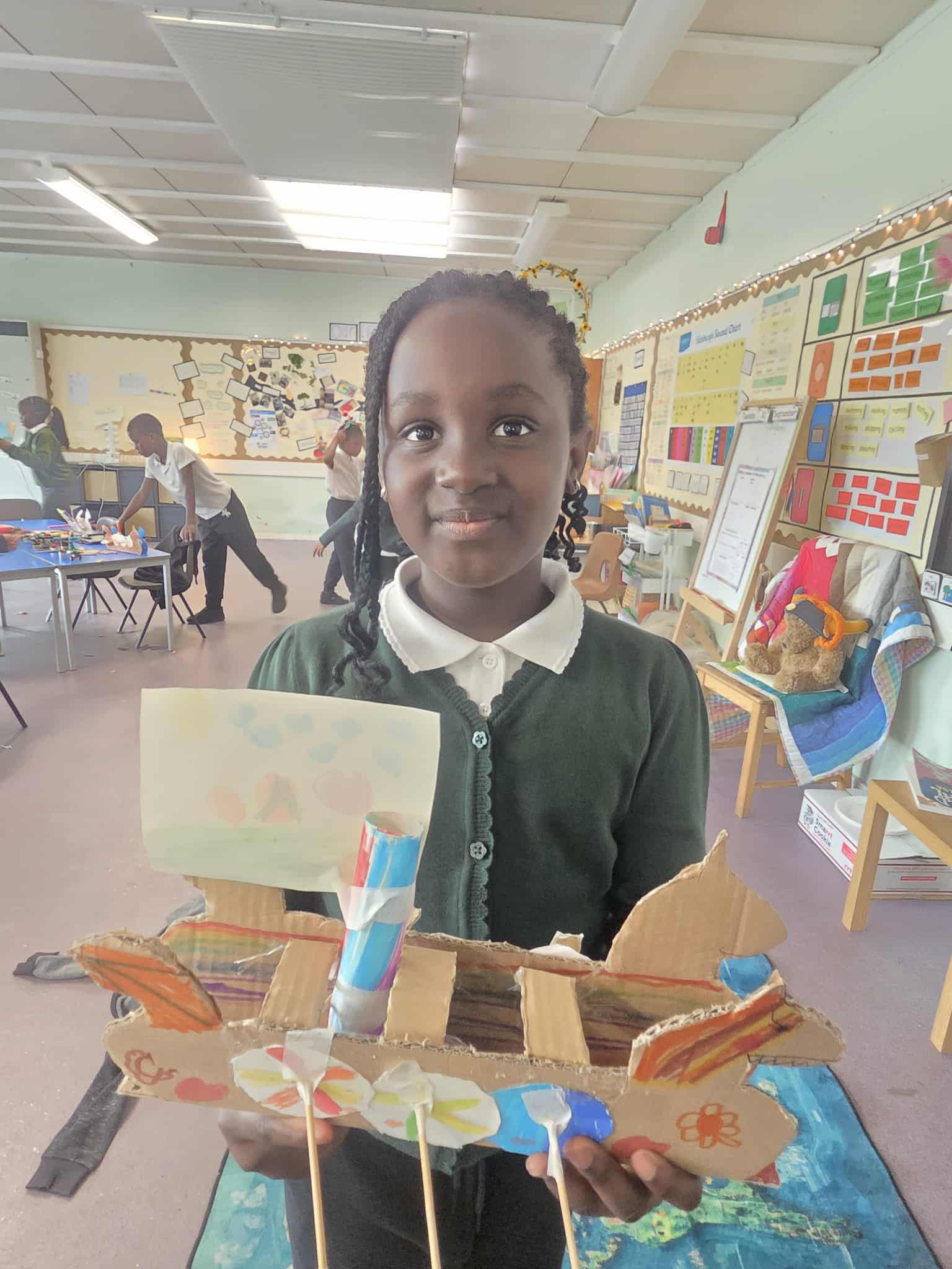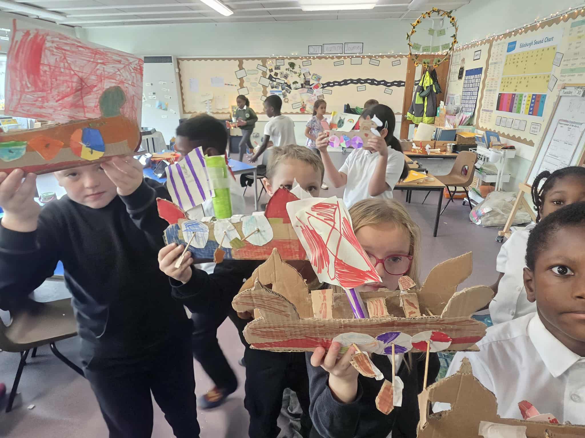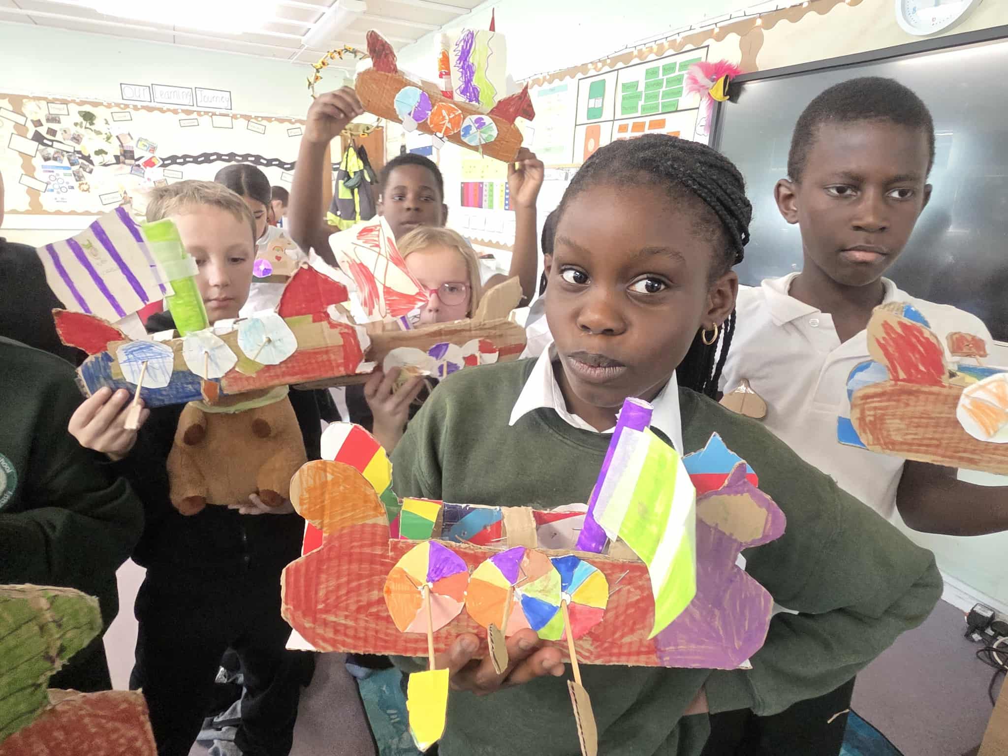 Wow we worked hard creating and building our Long ships. It took 5 different lessons to complete all the different elements of the ship – the mast, sail, oar holes, oars, rudders and the ship itself. We are very proud of the final result.