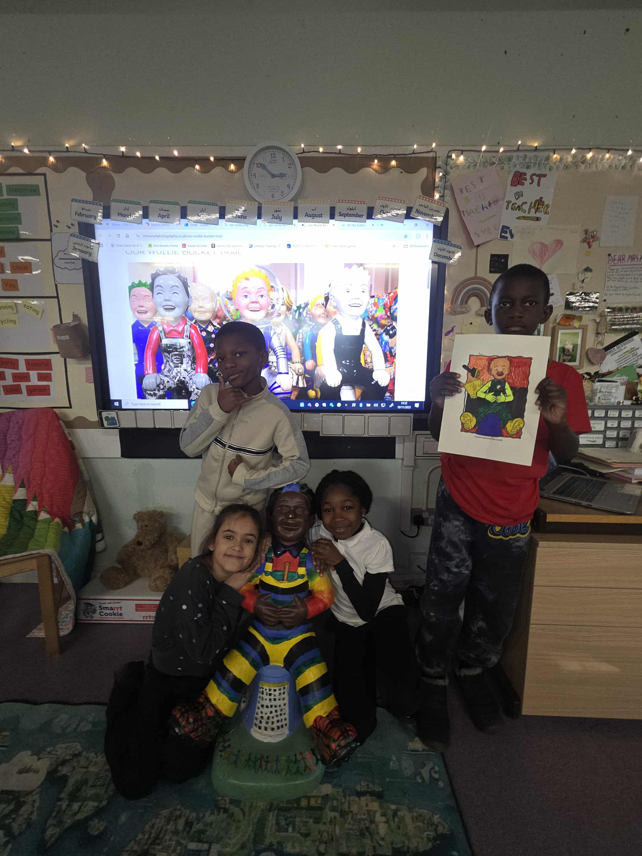 For join the learning this time, we used Scottish Book Week as inspiration for today’s learning. We looked at the fabulous Scottish cartoon – Oor Wullie. It was very funny learning new words in Scots, such as shoogly, lugs, help ma boab, birlin and haud yer wheest. We sang ‘heed, shooders, knaps and taes’ too. Thank you for the family members who came along to join our learning.