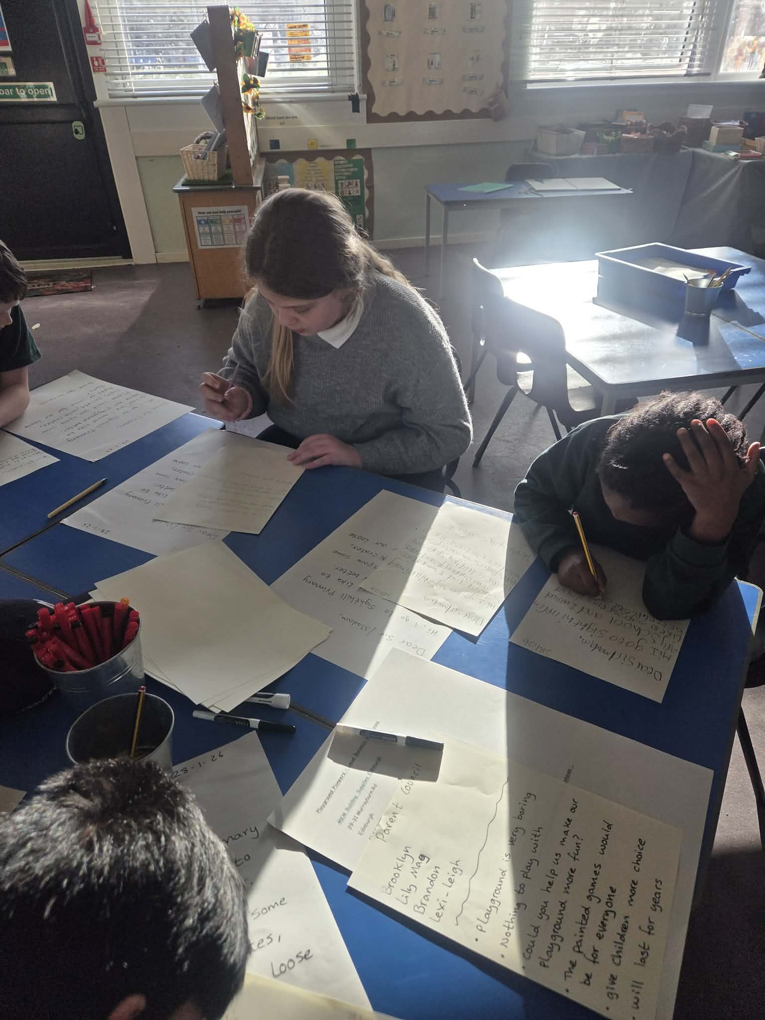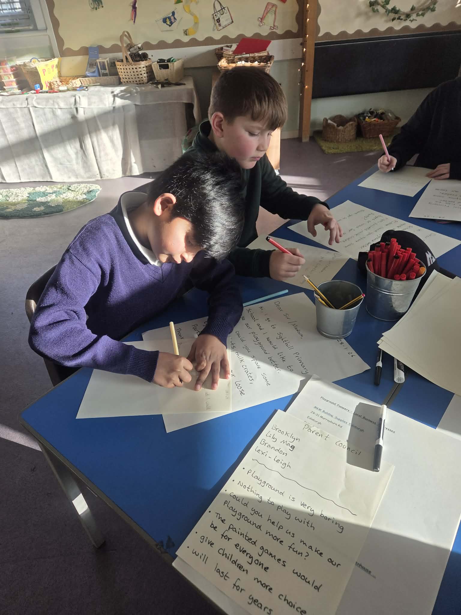 This was a very productive meeting. We split into 2 groups. 1 group wrote letters to local building and plumbing companies to ask for any free donations of loose parts, such as pipes, tyres, or pallets. Fingers crossed we get some positive replies and speedy donations. The other group re-designed the playground to include the new painted games that we are hoping to get in the very near future.