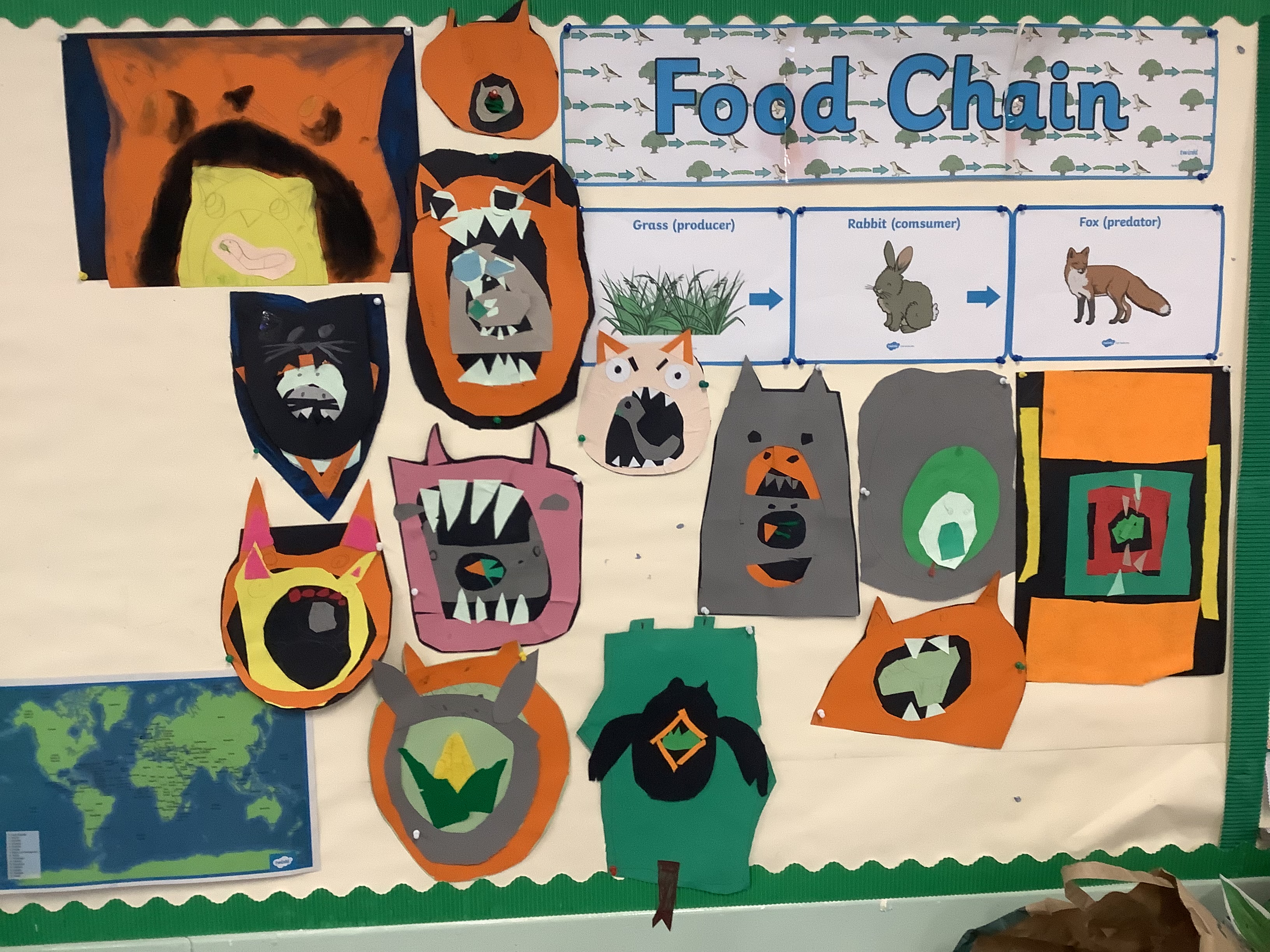 As part of our Science in Term 3, we have been learning about food chains. We have learned the terms “producer”, “consumer”, “prey” and “predator”. We particularly enjoyed creating our own food chain artwork. Have a look at some it below!