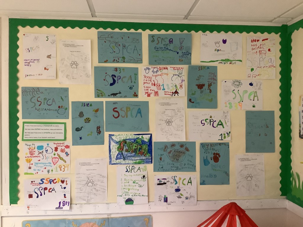 As part of this Scottish Learning we did some work around the poem “A Dug A Dug by Bill Keys. In the poem it references the RSPCA. This sparked some interesting discussion about the RSPCA and SSPCA which is Scotland’s own charity for helping animals. The children did some fantastic research around the SSPCA using the website and leaflets. They learned so many things and then created their own SSPCA posters. Here they are below!