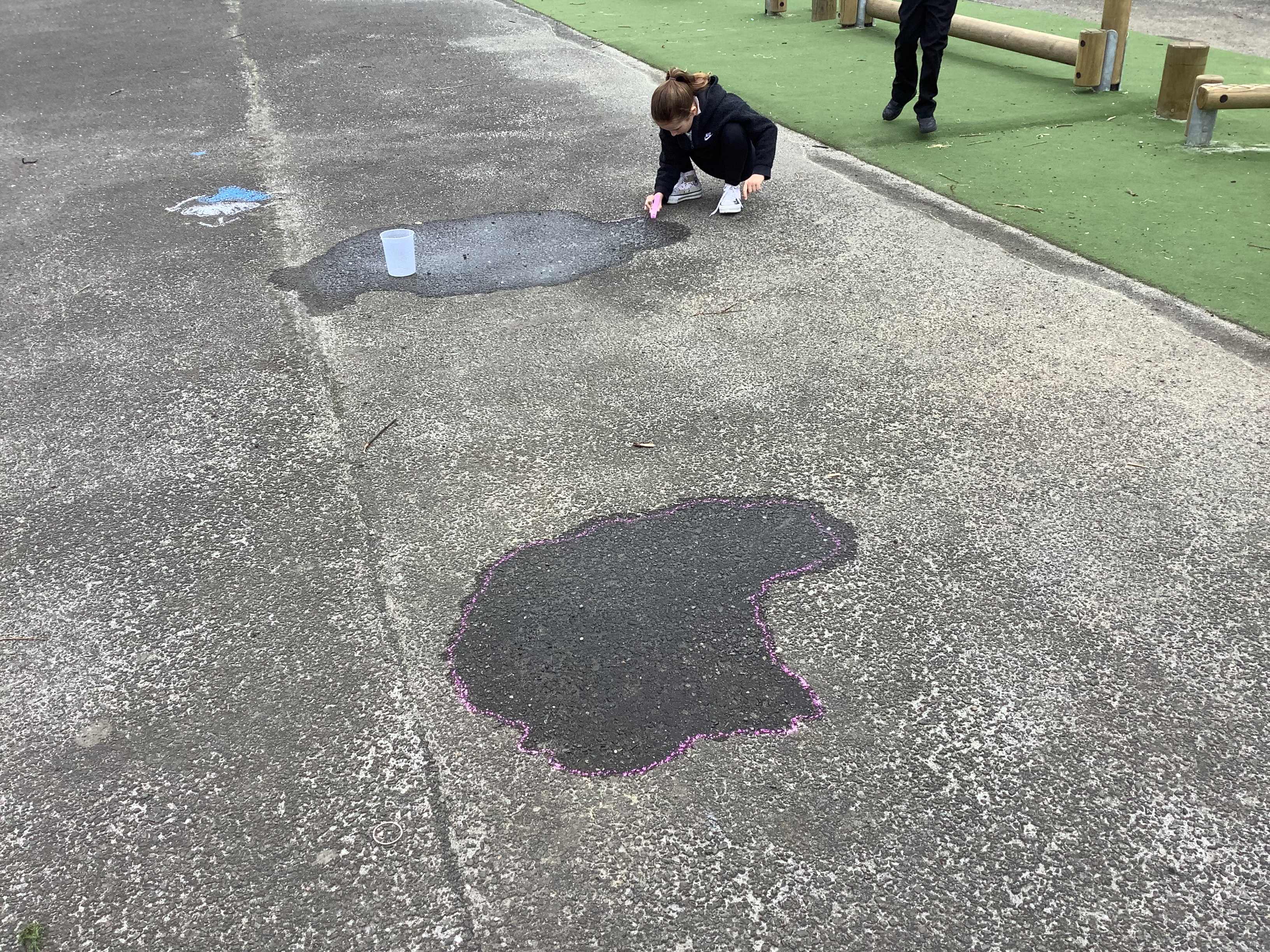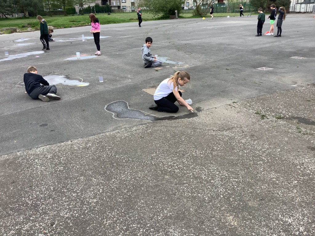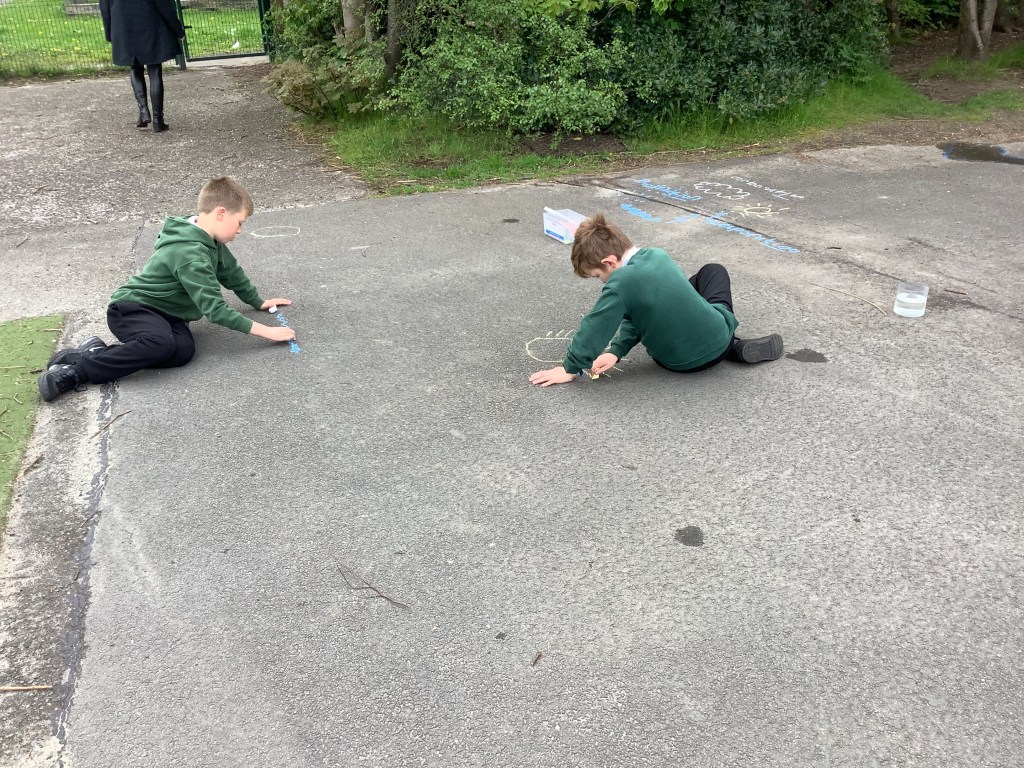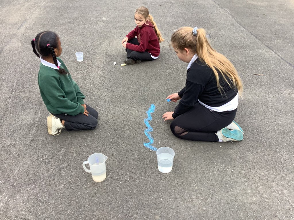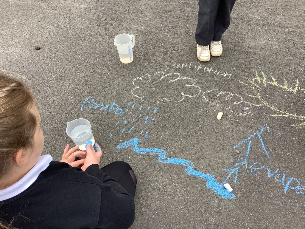 In Term 4, we have been learning about The Water Cycle. We have experimented with creating puddles outside and chalked around the outside of them to mark how big they were. We then waited a few hours and found that the majority had evaporated!